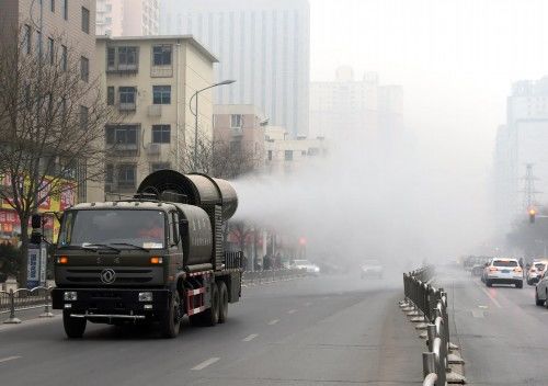 事情就發(fā)生在1月5日,河南省鄭州市經(jīng)三路上出現(xiàn)一輛大卡車,車上拉著一個大炮筒。工作人員說,這是一輛多功能抑塵車,俗稱“霧炮車”?!斑@輛車能裝10噸水,供霧炮噴射75分鐘。”工程師張國強說,霧炮車噴射的水霧顆粒達到微米級,能有效分解空氣中的污染顆粒物、塵埃等,有效緩解霧霾。