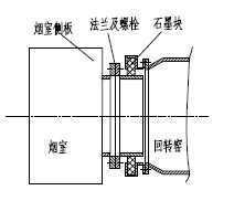 該廠的回轉(zhuǎn)窯在使用中發(fā)現(xiàn),窯在上行位置時,窯尾密封裝置的石墨塊掛碰煙室的法蘭及螺栓。操作人員發(fā)現(xiàn)及時進行了上報,停機檢查發(fā)現(xiàn),煙室側(cè)板向回轉(zhuǎn)窯方向鼓起變形約40,與煙室側(cè)板一體的法蘭及螺栓在側(cè)板的帶動下向窯方向移位,當窯到上行位置時石墨塊掛碰法蘭及螺栓。