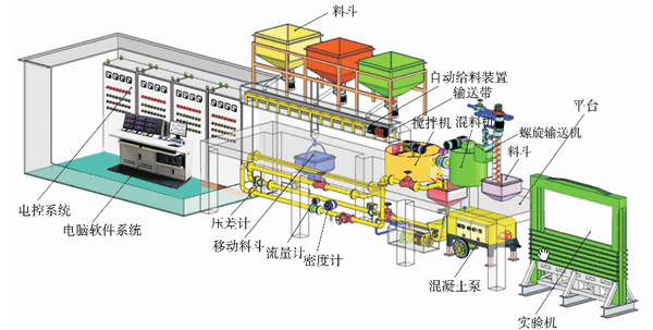 建筑垃圾再生骨料膏體充填材料以破碎、篩分后的建筑垃圾為骨料,粉煤灰為主要膠凝材料。首先需要膏體充填系統(tǒng),這里我們使用室內(nèi)充填模擬系統(tǒng),其主要組成部分包括自動稱重裝置、自動上料機、攪拌機、攪拌桶、空氣壓縮機、混凝土泵、充填管道、管道清洗機、采場模擬裝置和控制系統(tǒng)等,如圖1所示。