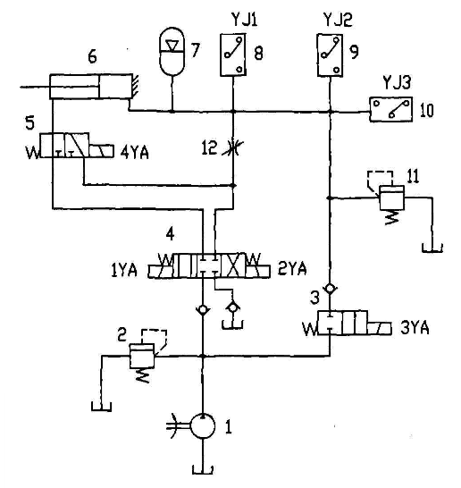 若高硬度的物料不能自動(dòng)落下,則有輔助裝置清除。當(dāng)油缸6左腔壓力下降到壓力繼電器8所設(shè)定的值時(shí),3YA得電,油缸6活塞向右移動(dòng),破碎機(jī)迅速恢復(fù)正常的工作狀態(tài)。其中溢流閥11設(shè)定的壓力值要比壓力繼電器10設(shè)定值稍高,當(dāng)壓力繼電器10動(dòng)作失靈時(shí),溢流閥11就會(huì)開(kāi)啟,起溢流保護(hù)作用。節(jié)流閥12可以控制液壓缸6活塞運(yùn)動(dòng)的速度。