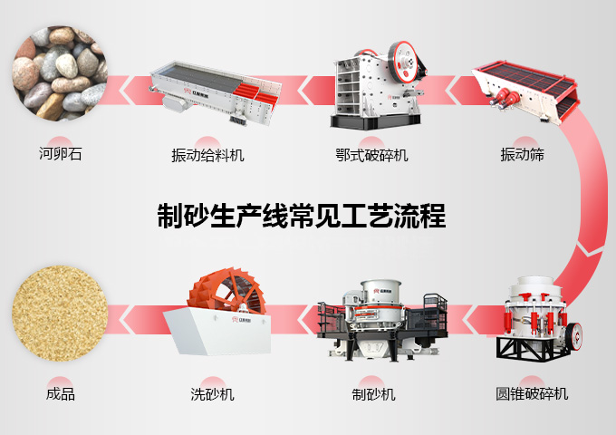 設(shè)備配置:顎式破碎機(jī)、細(xì)碎機(jī)、制砂機(jī)、洗砂機(jī)、振動(dòng)給料機(jī)、膠帶輸送機(jī)、直線振動(dòng)篩、集中電控等設(shè)備。