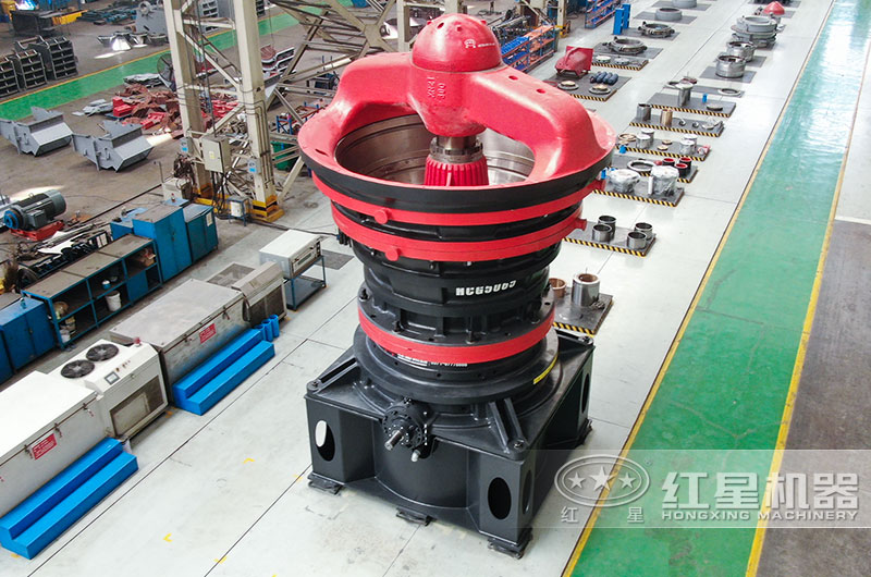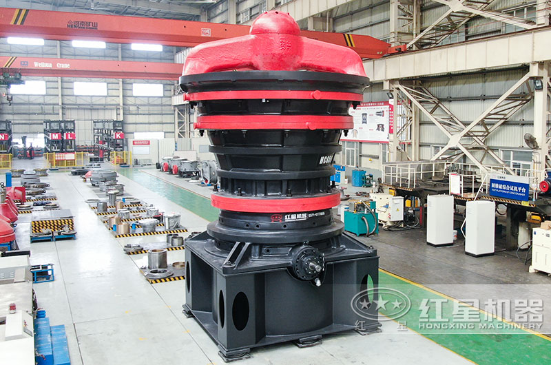 旋回式破碎機(jī)主要由橫梁部、上中下機(jī)架部、動(dòng)錐部、偏心套部、傳動(dòng)部和液壓缸部等組成。在設(shè)備工作時(shí),由電動(dòng)機(jī)帶動(dòng)水平軸旋轉(zhuǎn),水平軸通過齒輪帶動(dòng)偏心套旋轉(zhuǎn),再由偏心套帶動(dòng)動(dòng)錐部做圓周擺動(dòng),從而實(shí)現(xiàn)連續(xù)的擠壓破碎石塊??赏ㄟ^調(diào)節(jié)動(dòng)錐底部的液壓缸改變排礦口的大小,方便調(diào)整產(chǎn)品粒度;同時(shí)液壓缸也提供過鐵保護(hù)功能,當(dāng)有不能破碎的物體進(jìn)入破碎腔時(shí),液壓缸能自動(dòng)使動(dòng)錐下落釋放物體,保護(hù)破碎腔。